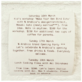 % Arabica offer latte art workshops on weekdays (10am - 6pm) and weekends (10am - 1pm).